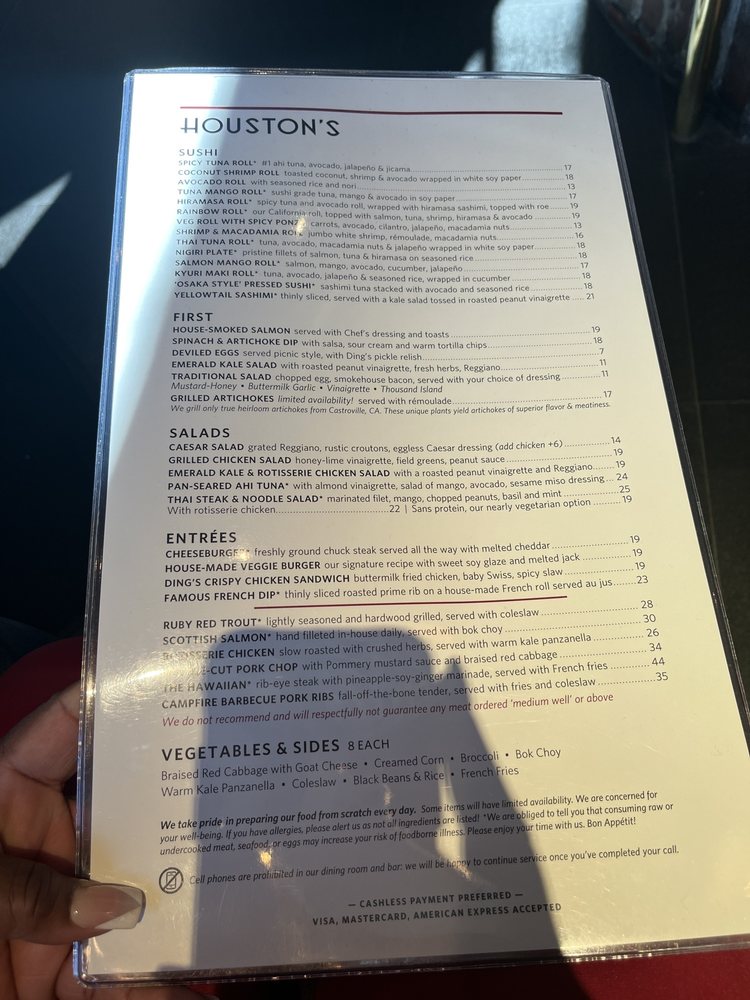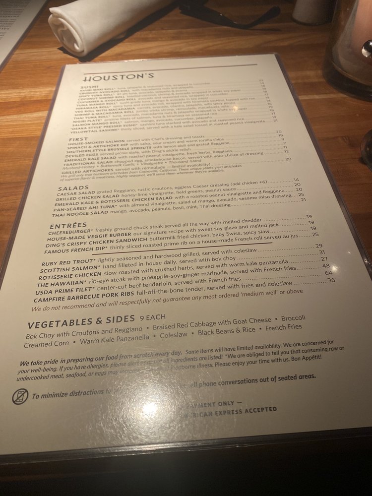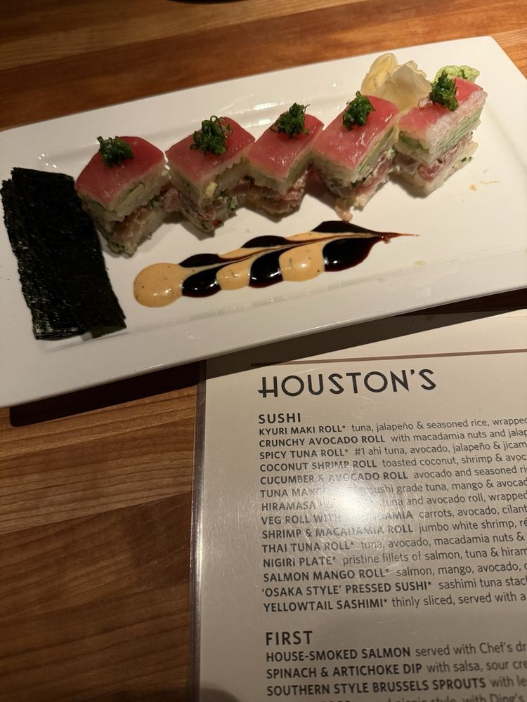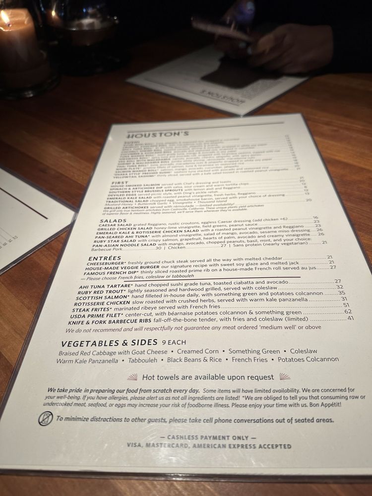 Located in Atlanta's upscale Buckhead neighborhood, Houston's offers a delightful experience for diners seeking New American cuisine infused with steakhouse flair. The menu is a treasure trove, featuring standout items such as the Housemade Veggie Burger and the Hawaiian Rib Eye, both highly praised for their bold flavors and quality. For sushi aficionados, the Coconut Shrimp Roll is a must-try, while the Silent But Deadly Brussels Sprouts provide the perfect touch of Southern charm.